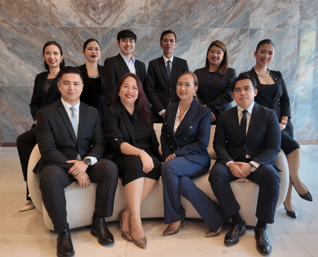Standing from left: Bianca de la Merced, Digital Marketing Manager; Reeca Jane Leonor, Front Office Manager; RL Santos, Accounting Manager; Michael Roseller Villaluz, Executive Housekeeper; Lala Ballan, E-commerce and Revenue Manager; and Pauline Anthonette Lumibao, Guest Experience Manager.