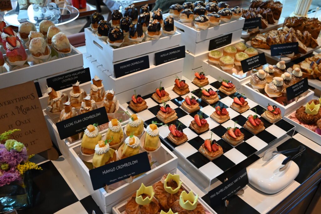 Before returning to sweeter notes, guests can pause at Frabjous, a savory and tea-inspired interlude with hot and cold selections. Offerings include warm and velvety smoked tomato cappuccino, golden and hearty Frabjous sausage roll, decadent Earl Grey tea cake, fresh and vibrant caterpillar garden roll, and delicate yet rich Red Queen salmon blinis, providing warmth, balance, and a gentle reset for the palate.