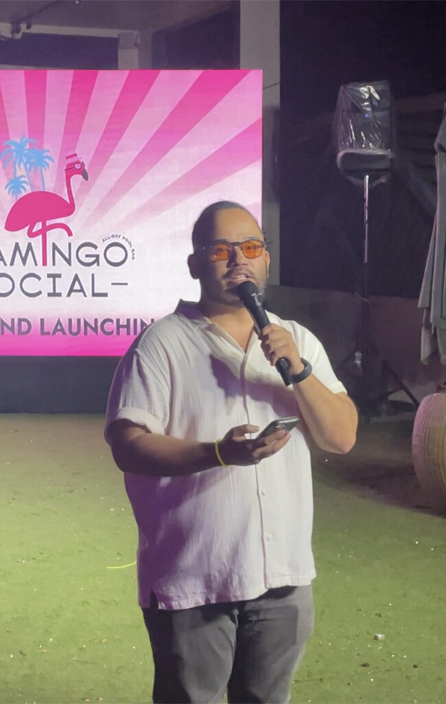 Alec Yatco, Hue group general manager, addresses guests during the grand launch of The Flamingo Social