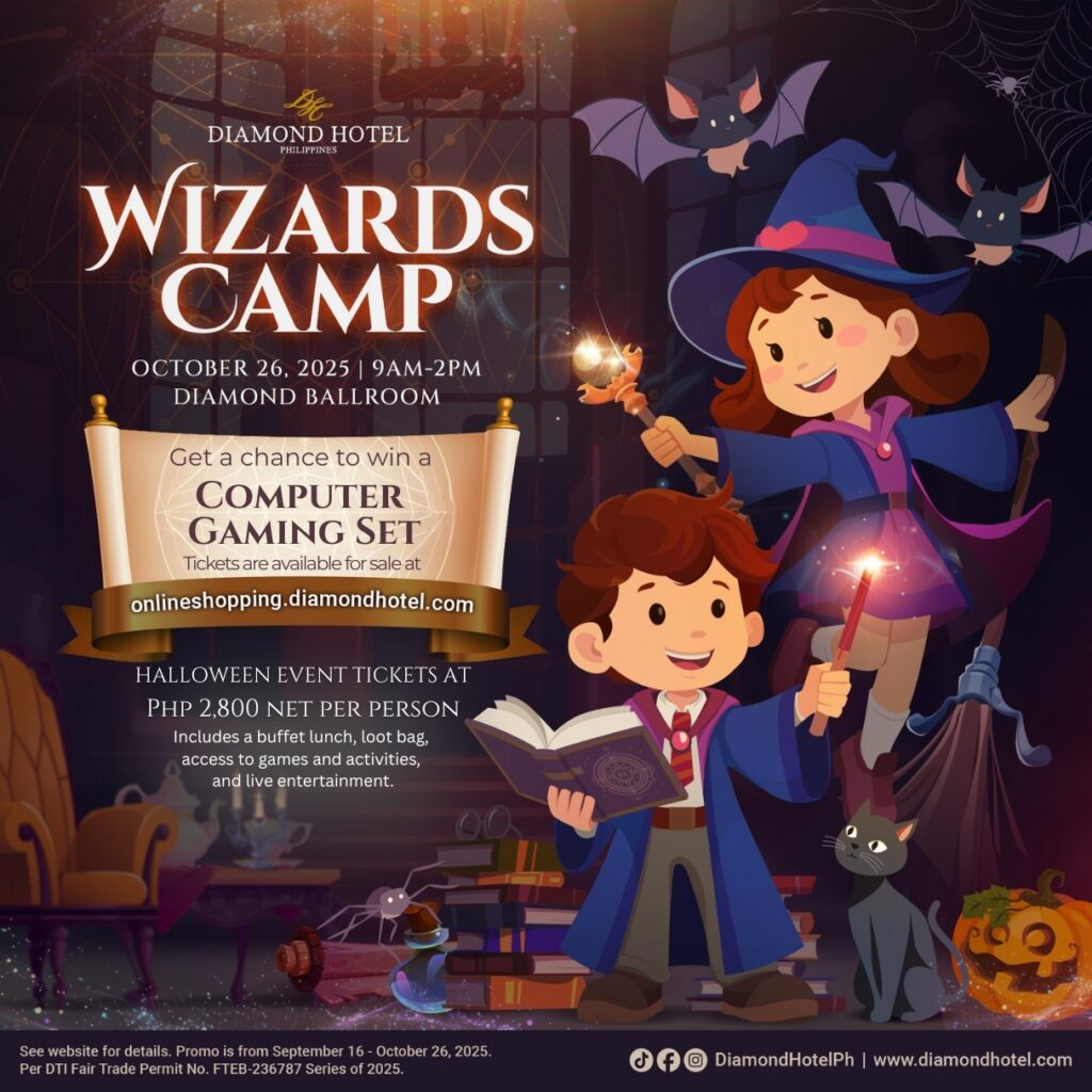 On October 26, 2025, young wizards-in-training are invited to the Wizards Camp at Diamond Ballroom from 9 AM to 2 PM. Doors open at 9 AM, while the program begins at 10 AM. The Halloween celebration promises a magical day filled with a buffet lunch, loot bags, fun games and activities, and live entertainment. Guests will also have the chance to win a Computer Gaming Set at the Grand Raffle. Tickets are priced at Php2,800 net per person, available for purchase at onlineshopping.diamondhotel.com.