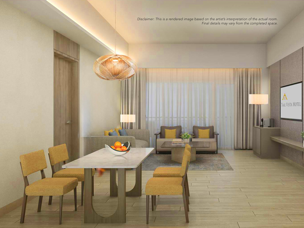 Artist’s perspective rendered photo: The contemporary and stylish living and dining area of the Batangas Suite.