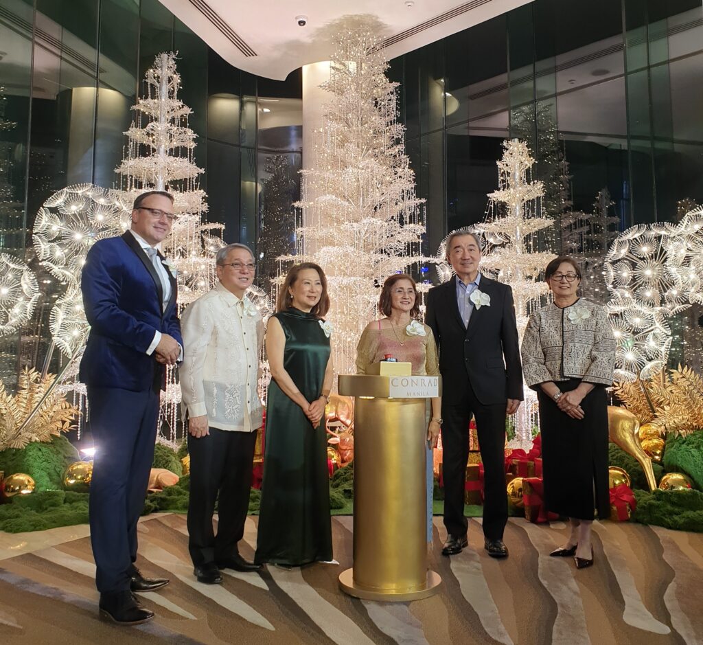 Luxury hotel Conrad Manila ushered in the Yuletide season with the lighting of its shining, shimmering, and glittery Christmas tree on its grand lobby. With the theme “Bright holidays, Brilliant memories,” the tree, adorned with sparkling crystals and gold and silver ornaments centered on messages of gratitude, family togetherness, and the warmth of the Christmas spirit.