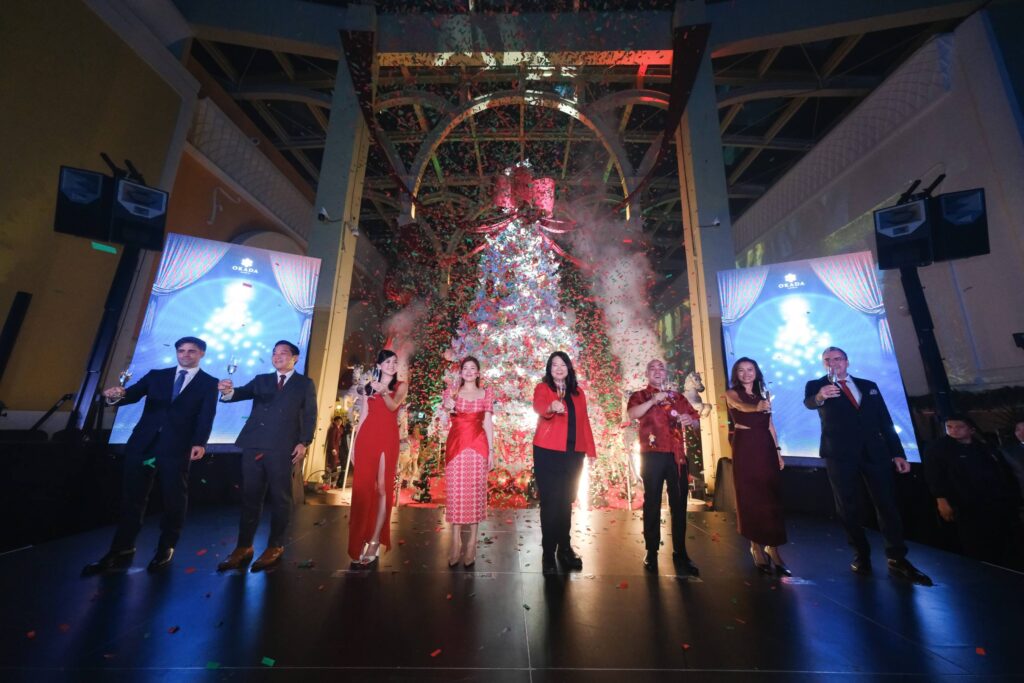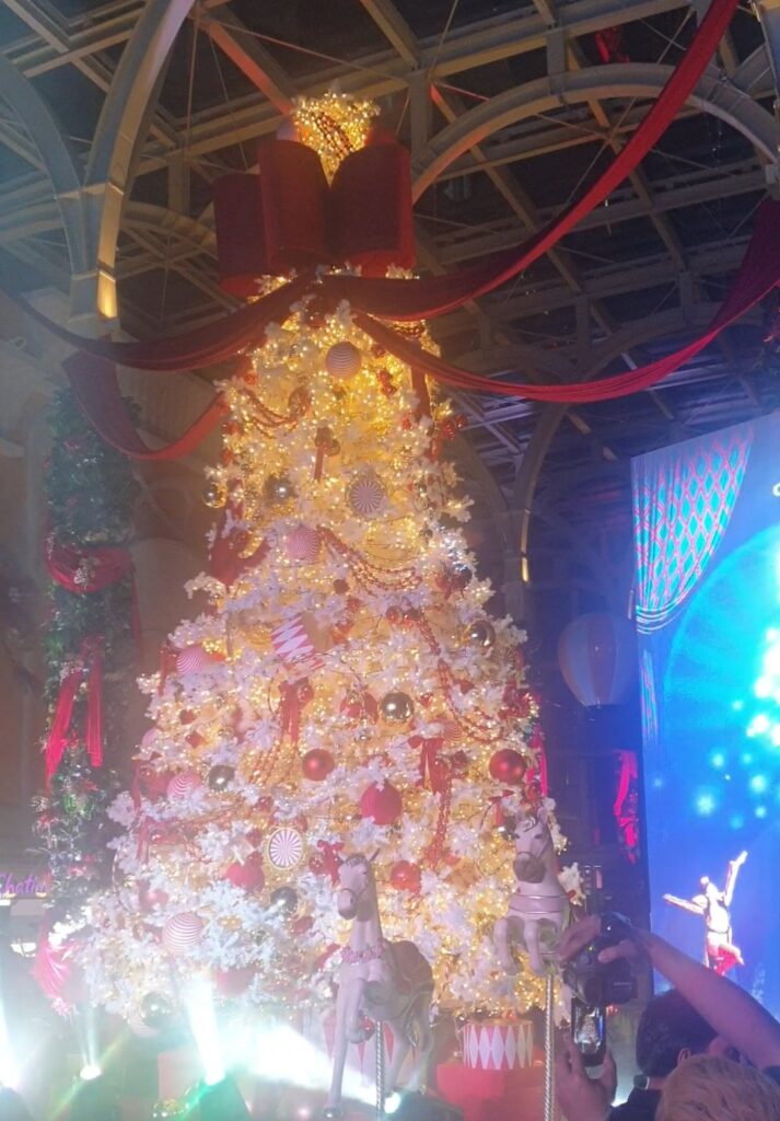 Okada Manila’s magnificent Christmas tree features bold red accents, striped ornaments, gold spheres, carousel horses, and whimsical hot air balloon elements inspired by the resort’s holiday theme, “Christmas Carnival.” Topped with a grand red bow and surrounded by festive decor, it stands as a vibrant centerpiece that captures the playful charm and wonder of the season.
